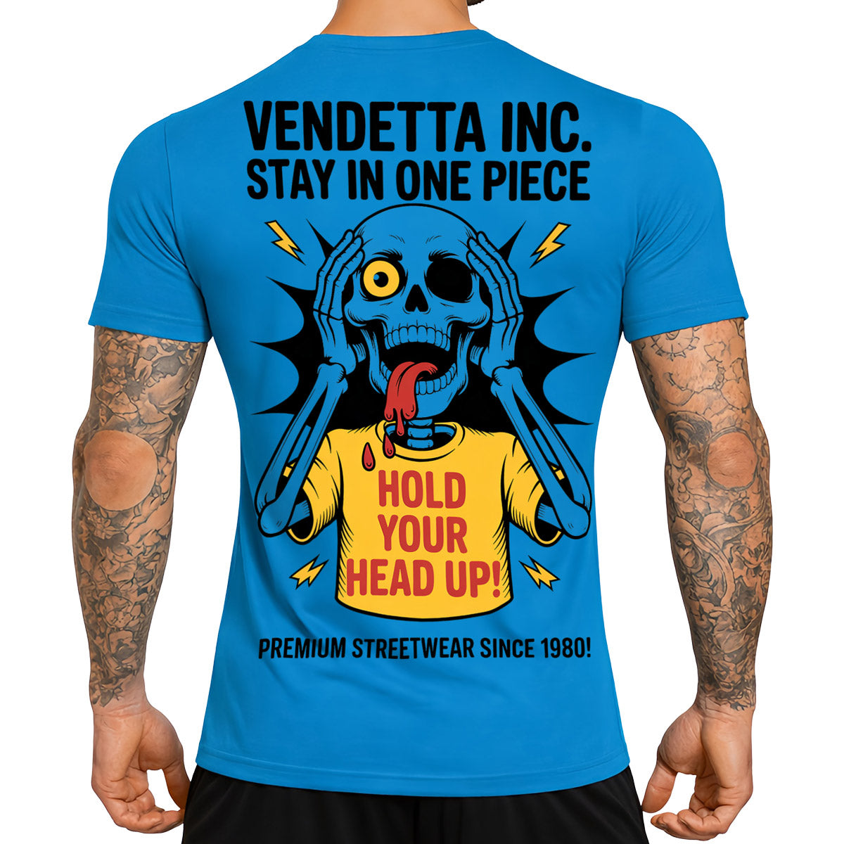 Dem Träger sieht man auf den ersten Blick an, dass er keine Kompromisse kennt. Auf der Frontseite prangt der Schriftzug Vendetta Inc.